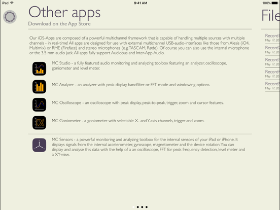 MC Levels is a powerful digital multichannel real-time full scale level meter for your iPad or iPhone. It displays signals from the internal microphones as well as the 3.5 mm audio jack.